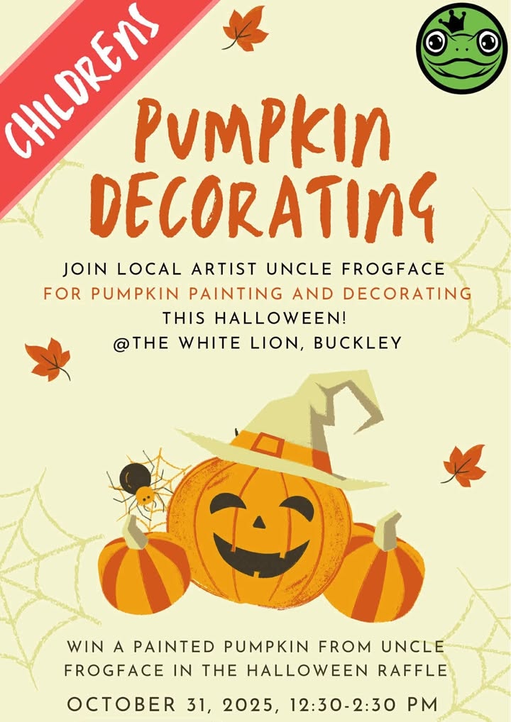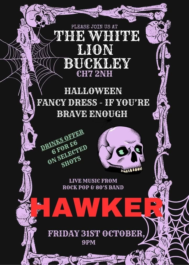 This Halloween Tomorrow at the White Lion we have a kids pumpkin painting 12.30 until 2.30 Then from 9.00pm we have the amazing Hawker joining us for some Spooky fun!!! And don't forget our Beer prices start from just £2.70. Bottles 2 for 7.50 and Spirits from only £5.75 for a double!! Time to party the night away